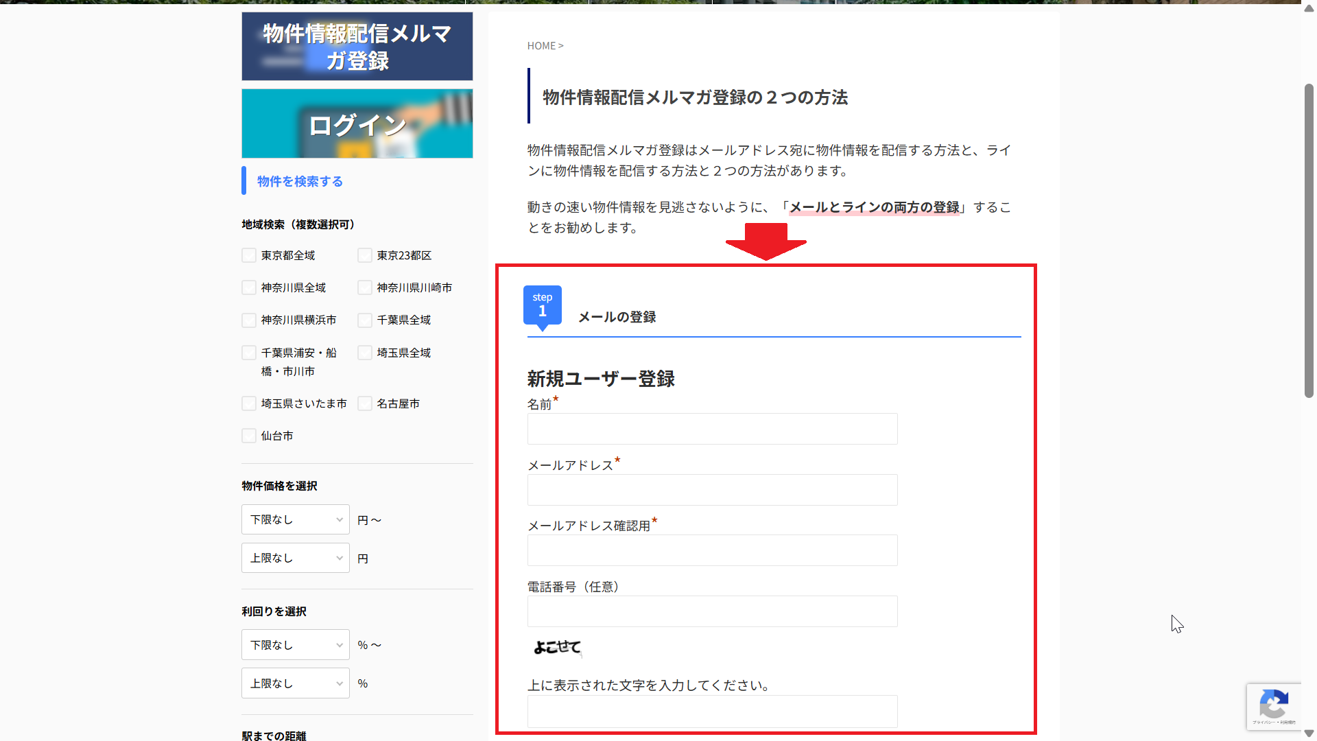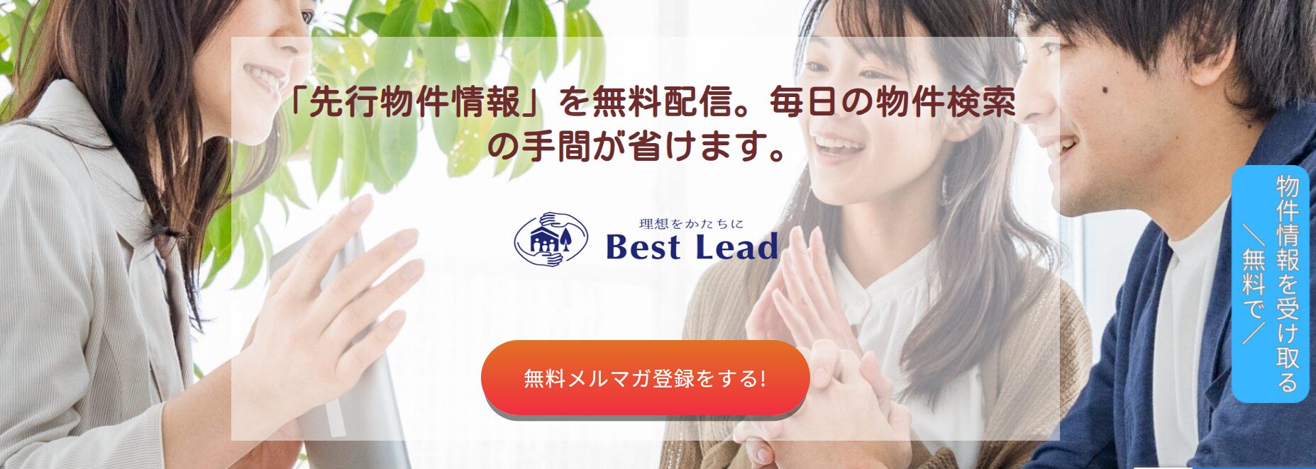 オレンジ色の無料「メルマガ登録をする!」ボタンか青色の「無料で物件情報を受け取る」ボタンをクリックする。